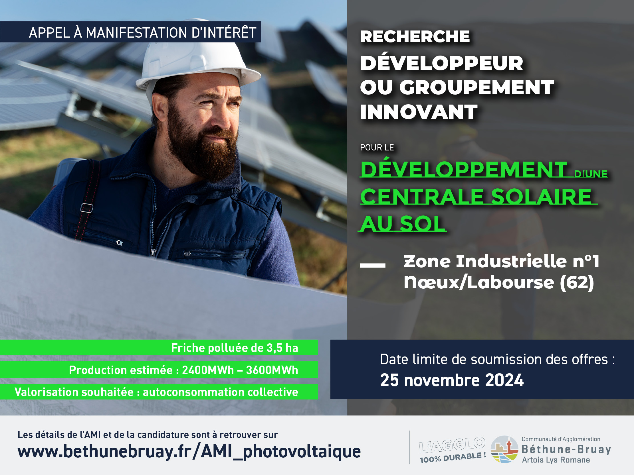 La Communauté d'Agglomération Béthune-Bruay Artois Lys Romane a identifié une friche polluée de 5 hectares (dont 3.5 ha de surface exploitable) située sur la zone industrielle n°1 Noeux/Labourse, comme site d’accueil pour une future centrale solaire. Ce projet stratégique répond à l’ambition de l’Agglomération de multiplier par 13 sa production d’énergies renouvelables d’ici 2050.