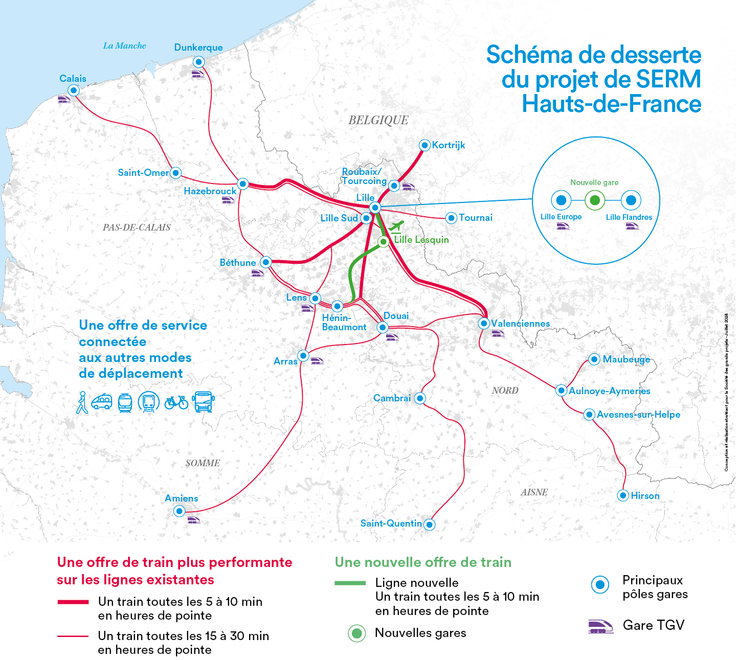 Le SERM Hauts-de-France est un service de mobilité multimodale dédié aux déplacements du quotidien, élaboré pour et avec les habitants et usagers. Il s’appuie prioritairement sur une augmentation du nombre de trains depuis et vers Lille et entre les pôles régionaux. Il rendra les gares plus accessibles grâce à une multiplication des modes de transport urbains et une desserte facilitée. L’objectif est d’améliorer les trajets grâce à des solutions fiables, efficaces et décarbonées.