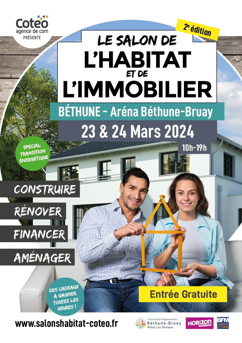 Envie de concevoir le projet immobilier de vos rêves ? Repenser les espaces et l'aménagement intérieur de votre habitat ? C'est le rendez-vous des inspirations et des tendances Habitat et Immo à ne pas manquer. Le Salon de l'Habitat et de l'Immobilier de Béthune, c'est le Rendez-vous des professionnels de la région pour vous aider et vous conseiller. Ameublement, architectes, chauffage, constructeurs, cuisinistes, décoration, énergies renouvelables, fermetures, isolation, menuiserie, paysagiste, rénovation, conseillers en financements, toitures, etc...Durant 2 jours, venez profitez d'offres "SPÉCIALES SALON ".