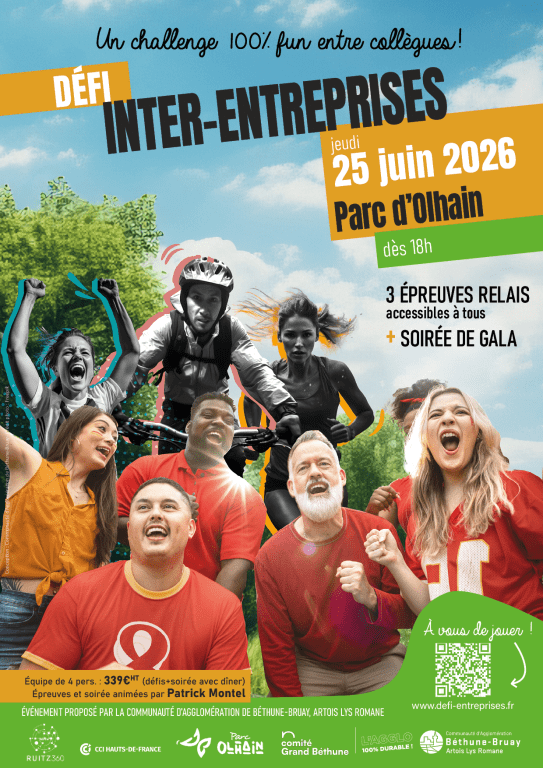 Le premier défi inter-entreprises se déroulera le 25 juin 2026, à partir de 18h, au Parc d’Olhain. Cet événement sportif unique en son genre, ouvert à toutes les entreprises et associations du territoire, est une excellente occasion de renforcer les liens au sein de vos équipes, de faire preuve de solidarité et de bonne humeur, tout en représentant fièrement votre société. Les détails du défi inter-entreprises : • Date : 25 juin 2026, à partir de 18h • Lieu : Parc d'Olhain, Béthune Bruay • Relais de 4 participants : course à pied (3,5 km), VTT (7 km) et parcours d'obstacles. • Coût : 339€ HT par équipe de 4 (participation + repas inclus). • Soirée festive à la fin pour célébrer les réussites. Pourquoi participer ? • Renforcez les liens dans votre équipe. • Développer des relations inter-entreprises • Passer un bon moment en dehors du cadre professionnel • Et bien sûr, vous amuser tout en relevant un défi sportif ! Retrouvez tous les détails dans le flyer !