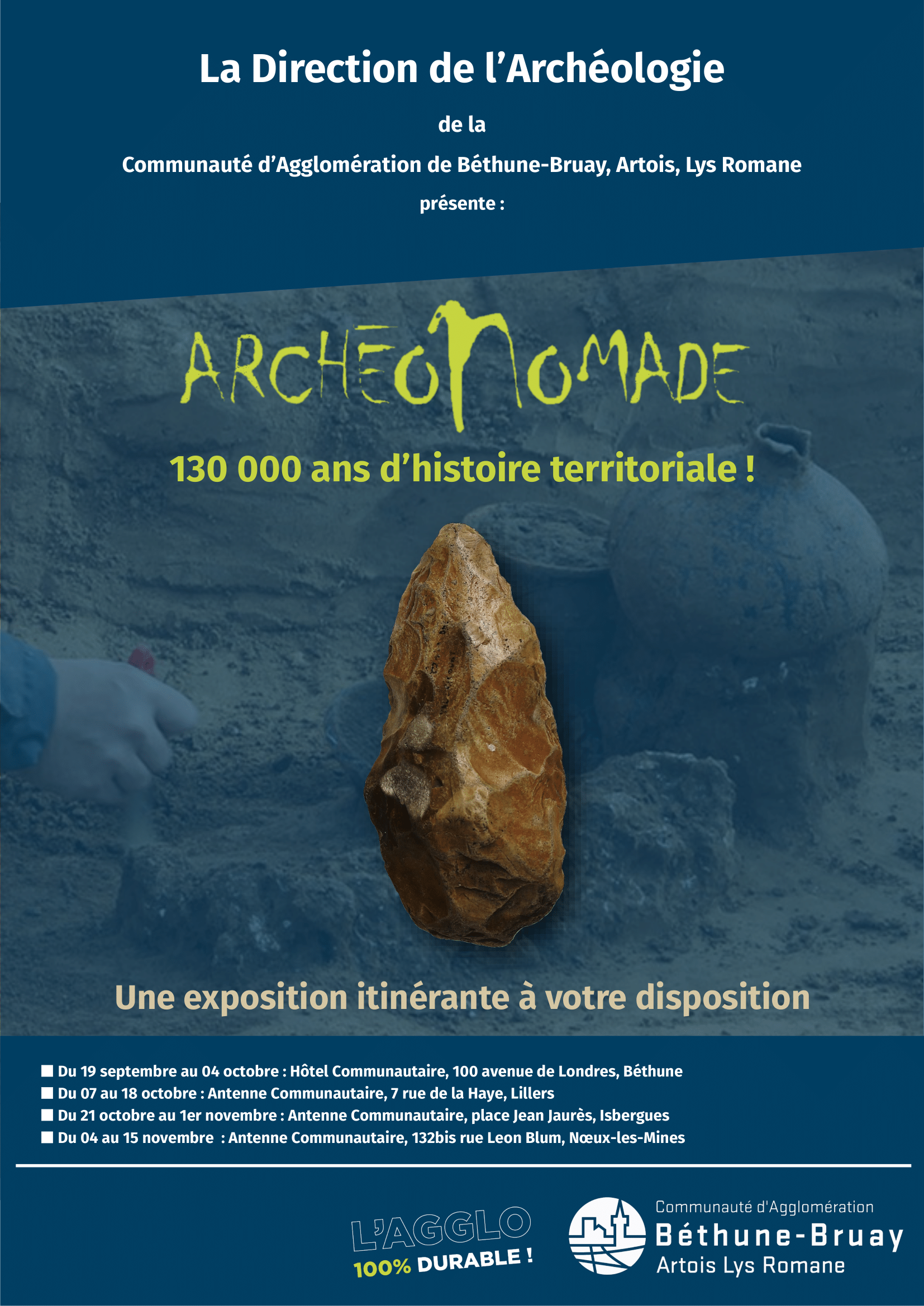 Ce sont pas moins de 57 objets issus du territoire, datant de la Préhistoire à l’époque Moderne, qui sont exposés dans une grande vitrine consacrée à l’archéologie territoriale. Complétée par 4 panneaux explicatifs et une carte, cette exposition, baptisée « Archéonomade », a vocation à voyager. Une façon de découvrir notre territoire autrement.