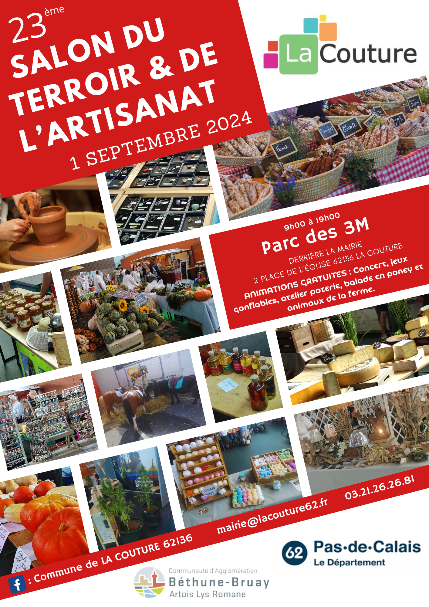 Passez un moment de convivialité au Parc des 3M, situé derrière la mairie. de nombreuses animations et activités gratuites : Balade en poney, animaux de la ferme, atelier poterie, concert... Restauration sur place. *vous souhaitez participer au salon en tant qu'exposant ? contactez-nous à mairie@lacouture62.fr