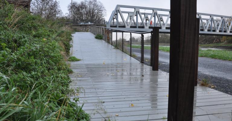 À chaque fois, un panneau pédagogique évoque d’un côté un symbole patrimonial de la Chaîne des Parcs du Pôle métropolitain de l’Artois, et de l’autre un pan d’histoire locale : les Baudets à Hinges, la battellerie à Annezin, le parc des industries Artois-Flandres à Douvrin/Billy-Berlcau, mais aussi les commerces et services situés à proximité. Là où ça le justifie, des passerelles ont été aménagées, et un marquage au sol a été réalisé. Exemple à Violaines, où le centre-bourg est désormais relié au chemin de halage. Pour les glissières, le bois a été privilégié.