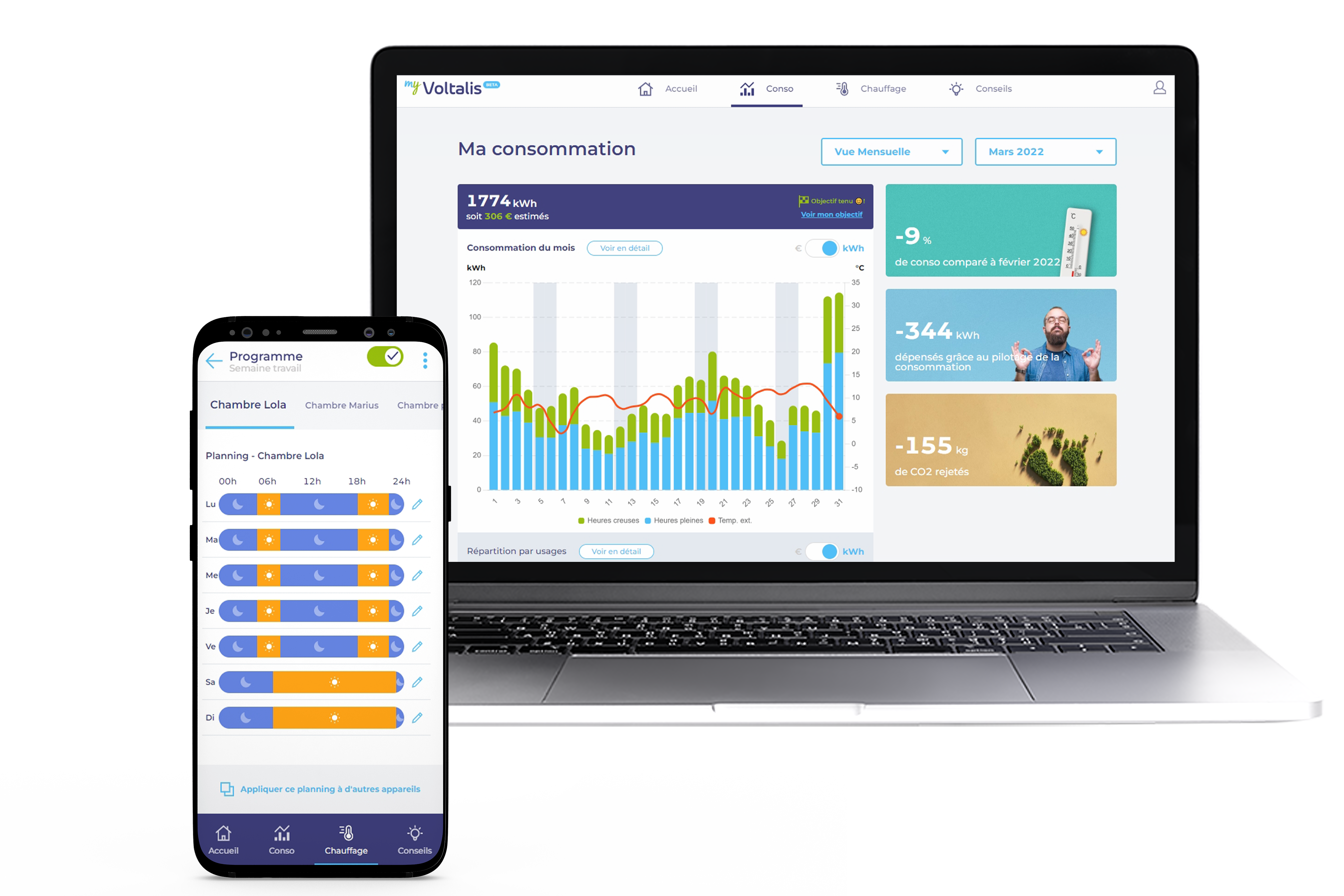Cette technologie permet également de soulager le système électrique lorsque celui-ci en a le plus besoin, comme lors des pics de consommation hivernaux ou d’une baisse de production des énergie renouvelables. Au lieu de faire appel à des centrales polluantes pour produire plus, le système électrique fait appel à Voltalis pour réduire la demande. Résultats : moins d’émissions de CO2 et des économies pour les foyers équipés.