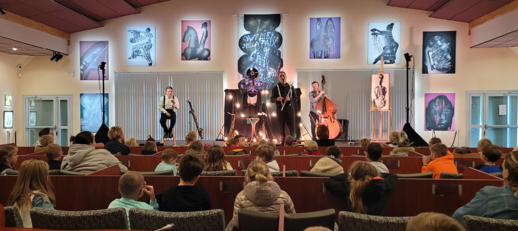Une fois le mystère de sa disparition éclairci, les musiciens ont présenté les instruments au spectateurs. Puis l’inspecteur Miaou a poursuivi l’enquête avec le jeune public pour identifier les tableaux de Kijno évoquant la musique. Douze classes de maternelles et de primaires ont ainsi pu découvrir le jazz et le conte théâtralisé.