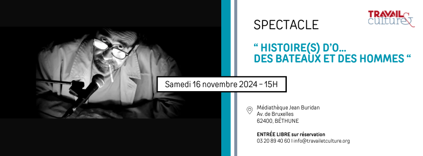 ➡️ SPECTACLE : Histoire(s) d’O… Des Bateaux et des Hommes (PARKOUR III) Création : Cie Théâtre K Production : Travail et Culture (TEC CRIAC) En scène, Jean-Pierre Moult, nous fait vivre une expérience unique au cœur de la nuit, en nous jouant en direct de son studio radiophonique, l’histoire tantôt éthérée et tantôt charnelle, tantôt tendre et tantôt passionnée, qui sera l’aboutissement d’un parcours initiatique auquel le spectateur sera à son tour invité. Jean-Pierre Moult, cette fois, nous embarquera à bord de « l’imaginaire », une promenade et des rencontres avec entre autre Simon, éclusier, qui va nous permettre de découvrir et de comprendre les enjeux actuels liés à nos fleuves et canaux. Un voyage théâtral en amont et en aval d’un mode de vie singulier, rythmé par le cours d’eau et le bouillonnement des écluses, la vie au grand air, le compagnonnage, dont ce spectacle va témoigner. ➡️ ÉCHANGES : Avec l’équipe artistique et les membres de Travail & Culture En partenariat avec la Médiathèque Jean Buridan, soutenu par la Communauté d’agglomération de Béthune Bruay Artois Lys Romane Les informations pratiques : 📅 Spectacle à 15H, le samedi 16 novembre 2024 📍 Médiathèque Jean Buridan - BÉTHUNE 🎟️ Entrée libre sur réservation : Travail & Culture 03 20 89 40 60 / info@travailetculture.org