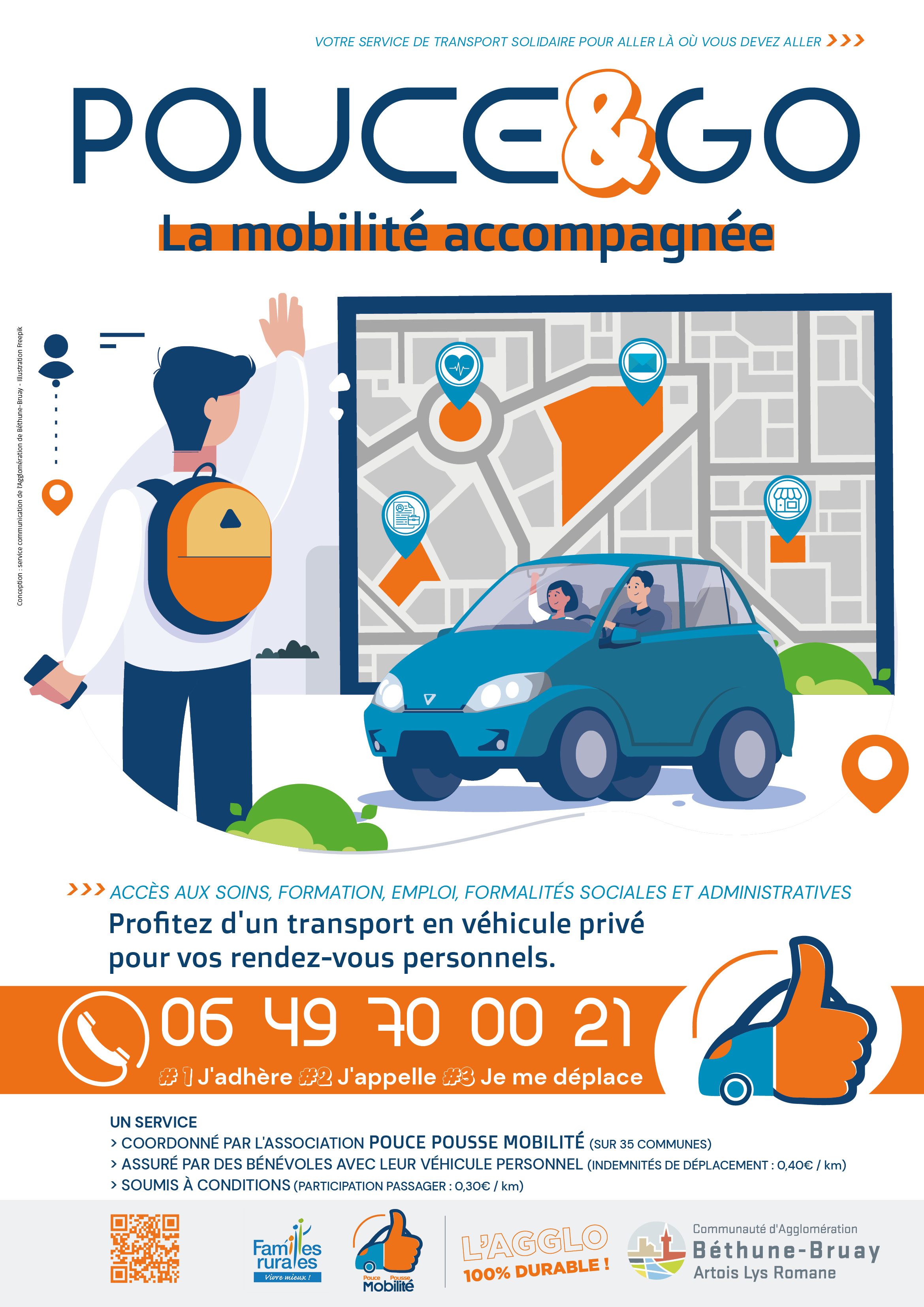 Pouce & Go LE service de transport solidaire de l'Agglo ! Ce service d'utilité sociale conçu dans le cadre des feuilles de route "Bien Vieillir" et « Mobilité » a pour but de favoriser la mobilité et l'autonomie des personnes vulnérables et/ou âgées.